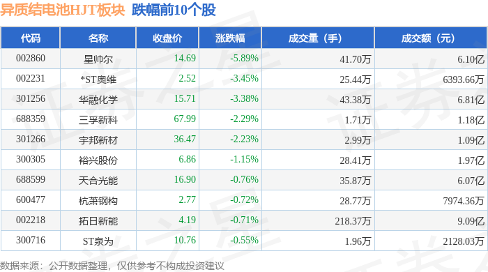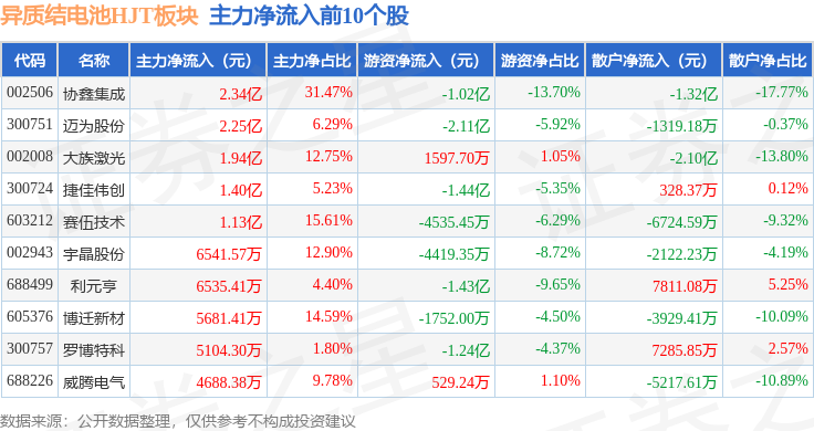 从资金流向上来看,当日异质结电池HJT板块主力资金净流入7.5亿元,游资资金净流出7.43亿元,散户资金净流出706.2万元。异质结电池HJT板块个股资金流向见下表: