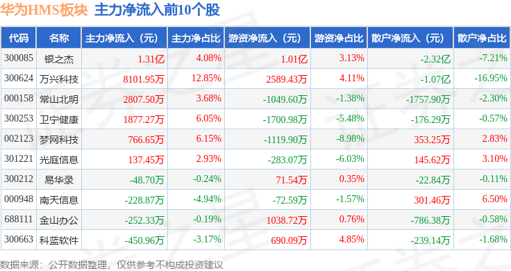 从资金流向上来看,当日华为HMS板块主力资金净流入5654.09万元,游资资金净流入1.66亿元,散户资金净流出2.23亿元。华为HMS板块个股资金流向见下表: