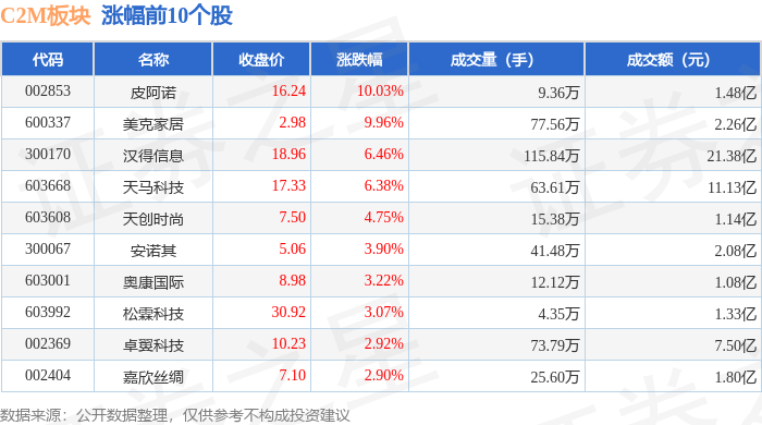 从资金流向上来看,当日C2M板块主力资金净流入2.69亿元,游资资金净流出1.66亿元,散户资金净流出1.03亿元。C2M板块个股资金流向见下表: