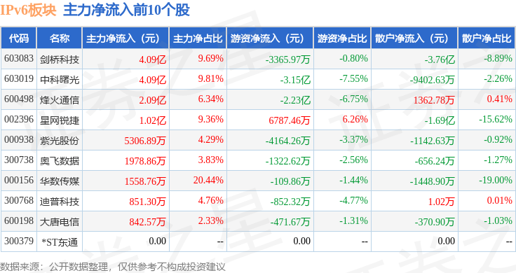 从资金流向上来看,当日IPv6板块主力资金净流入5.4亿元,游资资金净流出2.65亿元,散户资金净流出2.75亿元。IPv6板块个股资金流向见下表: