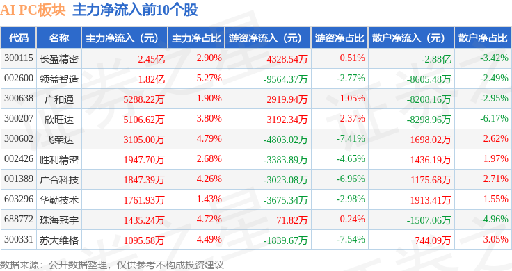 从资金流向上来看,当日AI PC板块主力资金净流出3.17亿元,游资资金净流入8040.99万元,散户资金净流入2.37亿元。AI PC板块个股资金流向见下表: