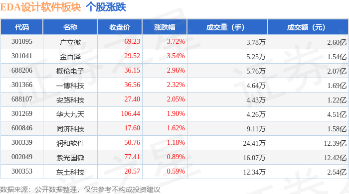证券之星消息,12月8日EDA设计软件板块较上一交易日上涨1.6%,广立微领涨。当日上证指数报收于3924.08,上涨0.54%。深证成指报收于13329.99,上涨1.39%。EDA设计软件板块个股涨跌见下表: