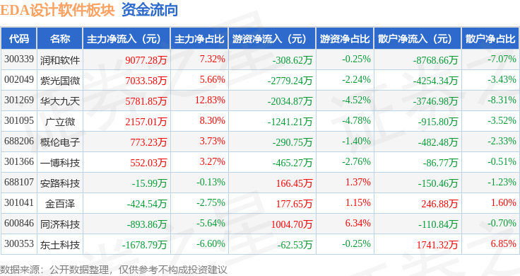 从资金流向上来看,当日EDA设计软件板块主力资金净流入2.24亿元,游资资金净流出5833.68万元,散户资金净流出1.65亿元。EDA设计软件板块个股资金流向见下表: