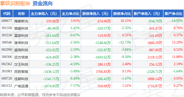 从资金流向上来看,当日掌纹识别板块主力资金净流出6767.83万元,游资资金净流入825.74万元,散户资金净流入5942.09万元。掌纹识别板块个股资金流向见下表: