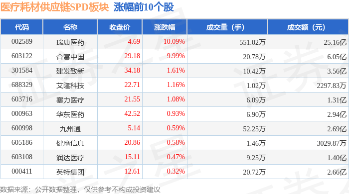 证券之星消息,12月8日医疗耗材供应链SPD板块较上一交易日上涨1.0%,瑞康医药领涨。当日上证指数报收于3924.08,上涨0.54%。深证成指报收于13329.99,上涨1.39%。医疗耗材供应链SPD板块个股涨跌见下表: