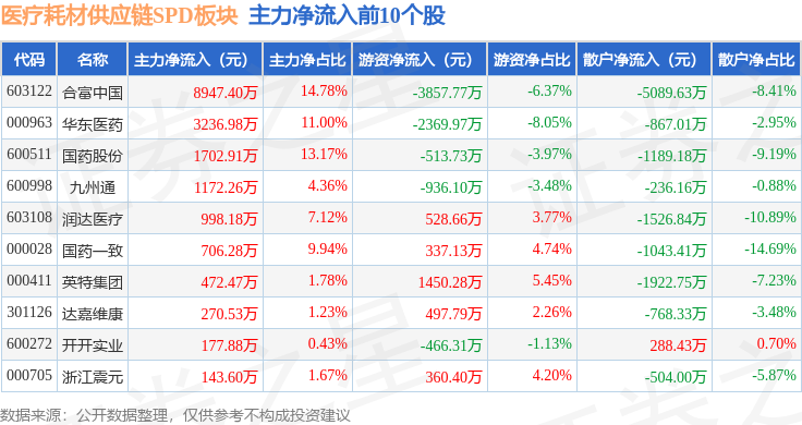 从资金流向上来看,当日医疗耗材供应链SPD板块主力资金净流出1.59亿元,游资资金净流入6548.74万元,散户资金净流入9338.39万元。医疗耗材供应链SPD板块个股资金流向见下表: