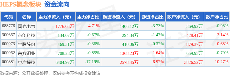 从资金流向上来看,当日HEPS概念板块主力资金净流出5940.6万元,游资资金净流入1836.17万元,散户资金净流入4104.44万元。HEPS概念板块个股资金流向见下表: