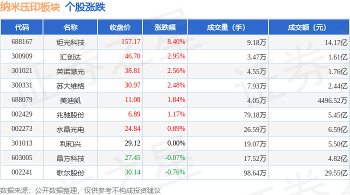 证券之星消息,12月8日纳米压印板块较上一交易日上涨0.72%,炬光科技领涨。当日上证指数报收于3924.08,上涨0.54%。深证成指报收于13329.99,上涨1.39%。纳米压印板块个股涨跌见下表: