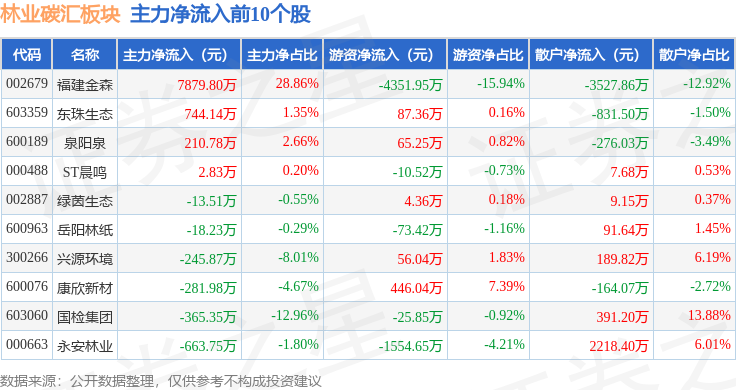 从资金流向上来看,当日林业碳汇板块主力资金净流入6576.54万元,游资资金净流出5019.01万元,散户资金净流出1557.52万元。林业碳汇板块个股资金流向见下表:
