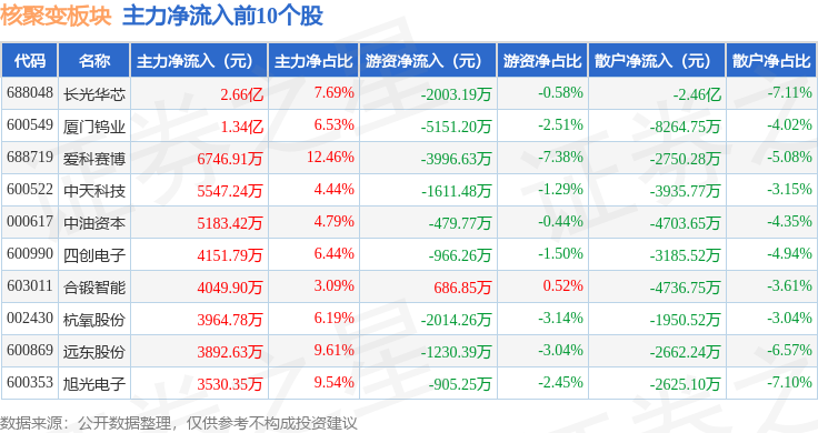 从资金流向上来看,当日核聚变板块主力资金净流出9.69亿元,游资资金净流入2645.2万元,散户资金净流入9.43亿元。核聚变板块个股资金流向见下表: