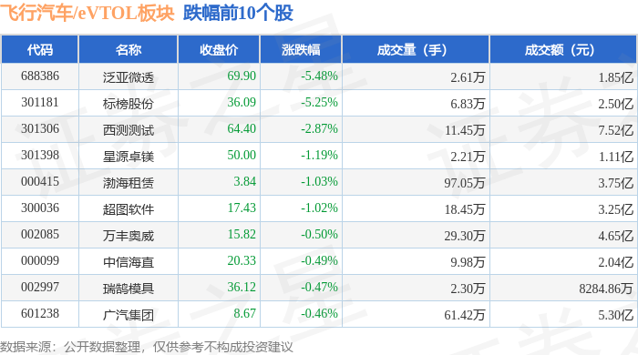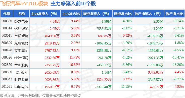 从资金流向上来看,当日飞行汽车/eVTOL板块主力资金净流出11.49亿元,游资资金净流出6.89亿元,散户资金净流入18.37亿元。飞行汽车/eVTOL板块个股资金流向见下表: