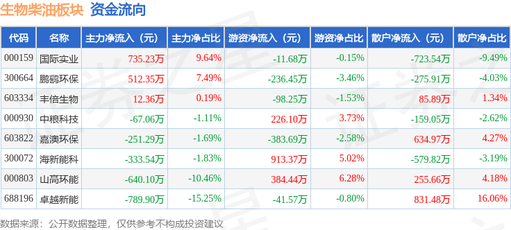 从资金流向上来看,当日生物柴油板块主力资金净流出821.94万元,游资资金净流入752.26万元,散户资金净流入69.68万元。生物柴油板块个股资金流向见下表: