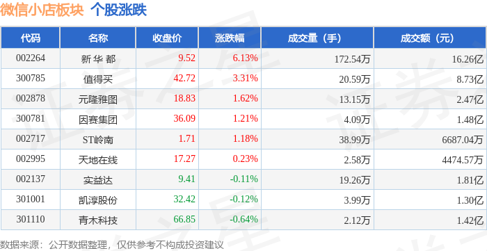 证券之星消息,12月8日微信小店板块较上一交易日上涨1.92%,新 华 都领涨。当日上证指数报收于3924.08,上涨0.54%。深证成指报收于13329.99,上涨1.39%。微信小店板块个股涨跌见下表: