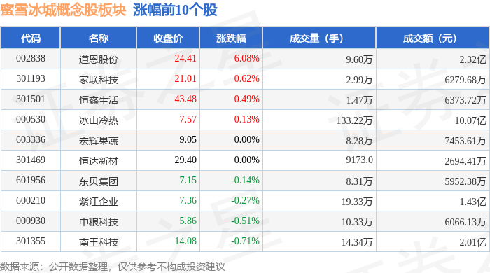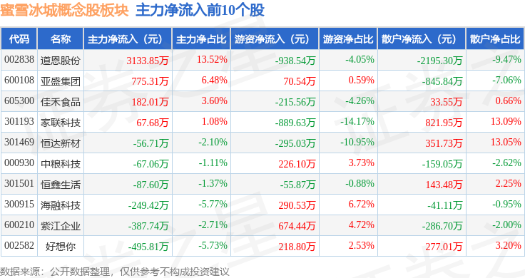 从资金流向上来看,当日蜜雪冰城概念股板块主力资金净流出1.28亿元,游资资金净流入772.46万元,散户资金净流入1.2亿元。蜜雪冰城概念股板块个股资金流向见下表: