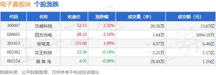 证券之星消息,12月8日电子鼻板块较上一交易日上涨1.28%,汉威科技领涨。当日上证指数报收于3924.08,上涨0.54%。深证成指报收于13329.99,上涨1.39%。电子鼻板块个股涨跌见下表: