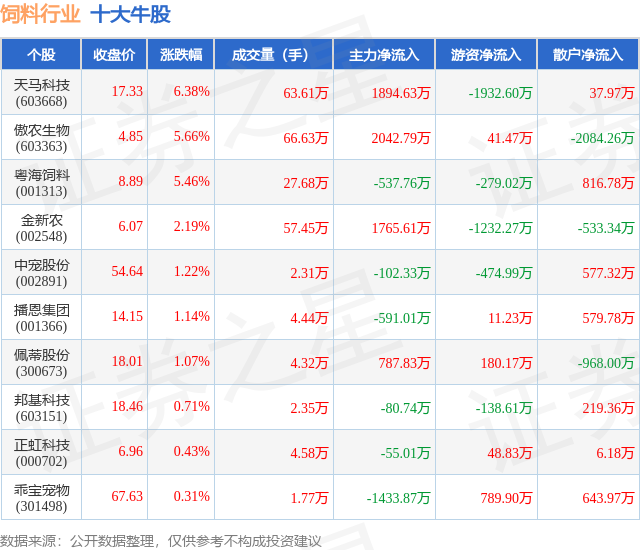 个股表现方面,饲料行业当日领涨股为天马科技(603668),该股当日报收17.33,上涨6.38%,成交量63.61万,主力资金净流入1894.63万元。傲农生物(603363)以上涨5.66%紧随其后,该股当日成交量66.63万,主力资金净流入2042.79万元。除此之外,粤海饲料(001313)、金新农(002548)、中宠股份(002891)均进入当日牛股之列。具体个股列表见下表: