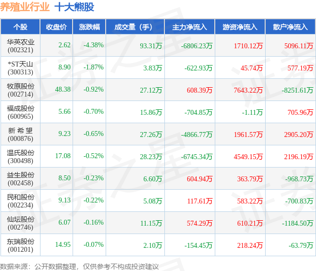 个股表现方面,养殖业行业当日领跌股为华英农业(002321),该股当日报收2.62,下跌4.38%,成交量93.31万,主力资金净流出6806.23万元。*ST天山(300313)以下跌1.87%紧随其后,该股当日成交量3.83万,主力资金净流出622.93万元。除此之外,牧原股份(002714)、福成股份(600965)、新 希 望(000876)均进入当日熊股之列。具体个股列表见下表: