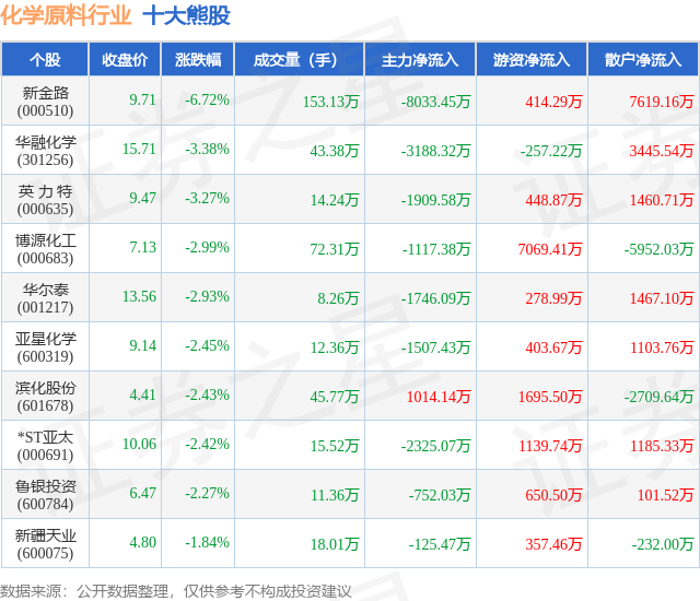 个股表现方面,化学原料行业当日领跌股为新金路(000510),该股当日报收9.71,下跌6.72%,成交量153.13万,主力资金净流出8033.45万元。华融化学(301256)以下跌3.38%紧随其后,该股当日成交量43.38万,主力资金净流出3188.32万元。除此之外,英 力 特(000635)、博源化工(000683)、华尔泰(001217)均进入当日熊股之列。具体个股列表见下表: