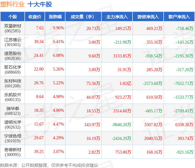 个股表现方面,塑料行业当日领涨股为双星新材(002585),该股当日报收7.62,上涨9.96%,成交量20.73万,主力资金净流入249.25万元。江苏博云(301003)以上涨6.41%紧随其后,该股当日成交量3.0万,主力资金净流出211.9万元。除此之外,道恩股份(002838)、聚石化学(688669)、东材科技(601208)均进入当日牛股之列。具体个股列表见下表: