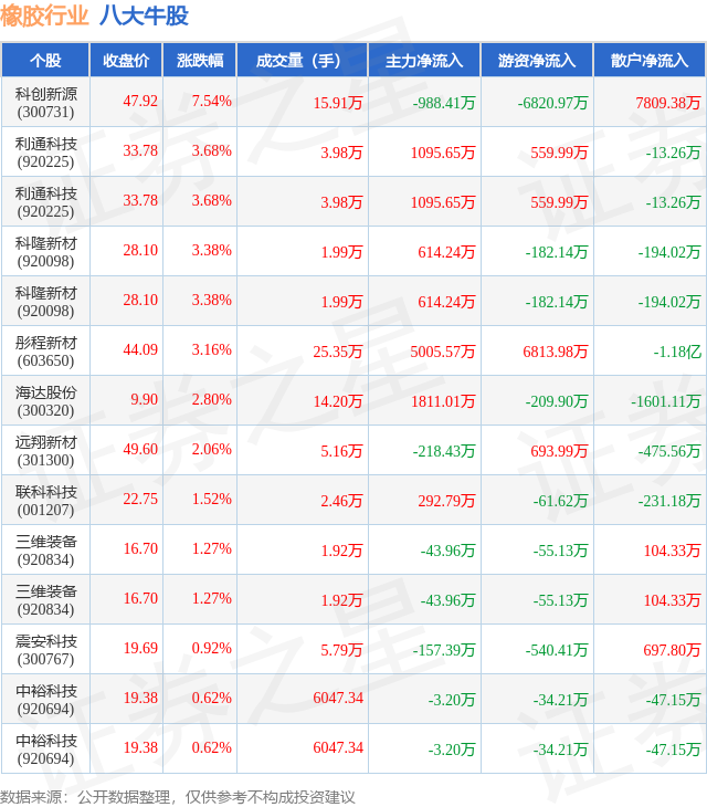 个股表现方面,橡胶行业当日领涨股为科创新源(300731),该股当日报收47.92,上涨7.54%,成交量15.91万,主力资金净流出988.41万元。利通科技(920225)以上涨3.68%紧随其后,该股当日成交量3.98万,主力资金净流入1095.65万元。除此之外,利通科技(920225)、科隆新材(920098)、科隆新材(920098)均进入当日牛股之列。具体个股列表见下表: