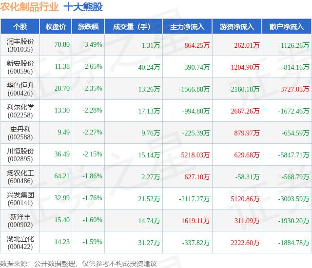 个股表现方面,农化制品行业当日领跌股为润丰股份(301035),该股当日报收70.8,下跌3.49%,成交量1.31万,主力资金净流入864.25万元。新安股份(600596)以下跌2.65%紧随其后,该股当日成交量40.24万,主力资金净流出390.74万元。除此之外,华鲁恒升(600426)、利尔化学(002258)、史丹利(002588)均进入当日熊股之列。具体个股列表见下表: