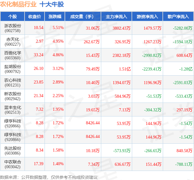 个股表现方面,农化制品行业当日领涨股为浙农股份(002758),该股当日报收10.54,上涨5.51%,成交量31.06万,主力资金净流入3802.43万元。赤天化(600227)以上涨4.95%紧随其后,该股当日成交量262.67万,主力资金净流入326.95万元。除此之外,百傲化学(603360)、盐湖股份(000792)、农心科技(001231)均进入当日牛股之列。具体个股列表见下表: