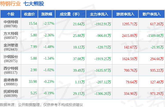 个股表现方面,特钢行业当日领跌股为中信特钢(000708),该股当日报收15.54,下跌2.57%,成交量21.64万,主力资金净流出1912.91万元。方大特钢(600507)以下跌2.36%紧随其后,该股当日成交量25.88万,主力资金净流出906.01万元。除此之外,金洲管道(002443)、沙钢股份(002075)、西宁特钢(600117)均进入当日熊股之列。具体个股列表见下表: