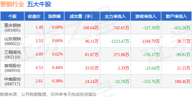 个股表现方面,普钢行业当日领涨股为重庆钢铁(601005),该股当日报收1.49,上涨0.68%,成交量108.04万,主力资金净流入742.65万元。山东钢铁(600022)以上涨0.66%紧随其后,该股当日成交量96.11万,主力资金净流出1223.47万元。除此之外,三钢闽光(002110)、首钢股份(000959)、中南股份(000717)均进入当日牛股之列。具体个股列表见下表: