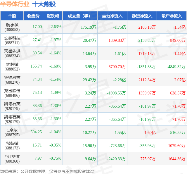 个股表现方面,半导体行业当日领跌股为航宇微(300053),该股当日报收17.0,下跌2.63%,成交量175.19万,主力资金净流出1.75亿元。宏微科技(688711)以下跌1.97%紧随其后,该股当日成交量20.47万,主力资金净流入1309.83万元。除此之外,天岳先进(688234)、纳芯微(688052)、臻镭科技(688270)均进入当日熊股之列。具体个股列表见下表: