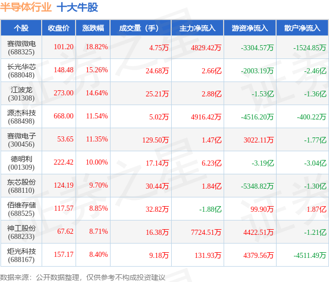 个股表现方面,半导体行业当日领涨股为赛微微电(688325),该股当日报收101.2,上涨18.82%,成交量4.75万,主力资金净流入4829.42万元。长光华芯(688048)以上涨15.26%紧随其后,该股当日成交量24.68万,主力资金净流入2.66亿元。除此之外,江波龙(301308)、源杰科技(688498)、赛微电子(300456)均进入当日牛股之列。具体个股列表见下表: