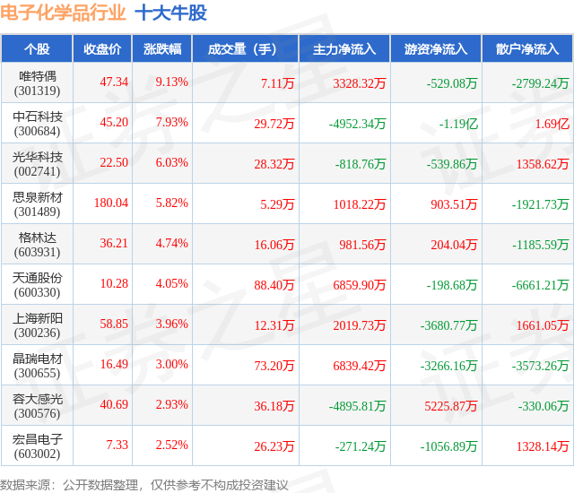 个股表现方面,电子化学品行业当日领涨股为唯特偶(301319),该股当日报收47.34,上涨9.13%,成交量7.11万,主力资金净流入3328.32万元。中石科技(300684)以上涨7.93%紧随其后,该股当日成交量29.72万,主力资金净流出4952.34万元。除此之外,光华科技(002741)、思泉新材(301489)、格林达(603931)均进入当日牛股之列。具体个股列表见下表: