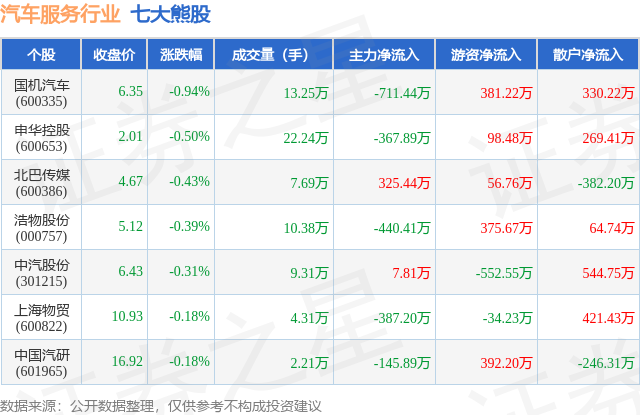 个股表现方面,汽车服务行业当日领跌股为国机汽车(600335),该股当日报收6.35,下跌0.94%,成交量13.25万,主力资金净流出711.44万元。申华控股(600653)以下跌0.5%紧随其后,该股当日成交量22.24万,主力资金净流出367.89万元。除此之外,北巴传媒(600386)、浩物股份(000757)、中汽股份(301215)均进入当日熊股之列。具体个股列表见下表: