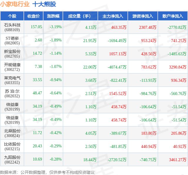 个股表现方面,小家电行业当日领跌股为石头科技(688169),该股当日报收157.05,下跌3.19%,成交量4.13万,主力资金净流入463.35万元。ST德豪(002005)以下跌1.89%紧随其后,该股当日成交量21.95万,主力资金净流出1694.49万元。除此之外,新宝股份(002705)、开能健康(300272)、莱克电气(603355)均进入当日熊股之列。具体个股列表见下表: