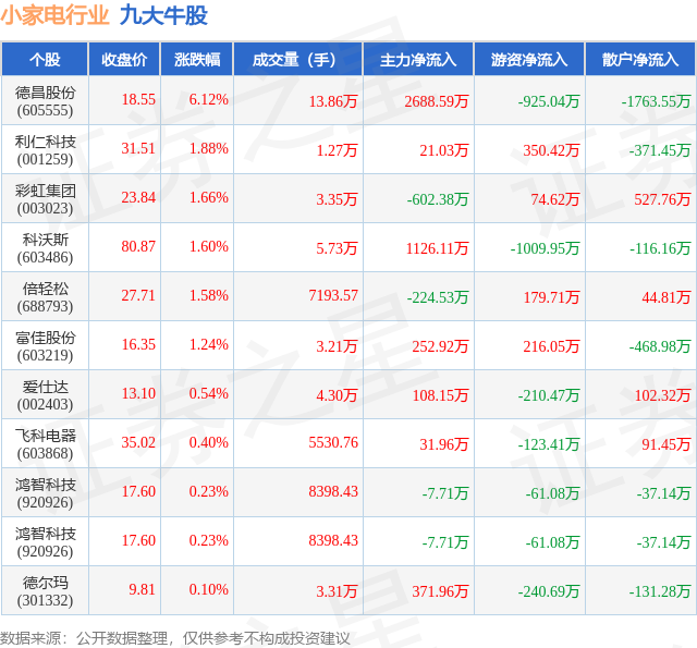 个股表现方面,小家电行业当日领涨股为德昌股份(605555),该股当日报收18.55,上涨6.12%,成交量13.86万,主力资金净流入2688.59万元。利仁科技(001259)以上涨1.88%紧随其后,该股当日成交量1.27万,主力资金净流入21.03万元。除此之外,彩虹集团(003023)、科沃斯(603486)、倍轻松(688793)均进入当日牛股之列。具体个股列表见下表: