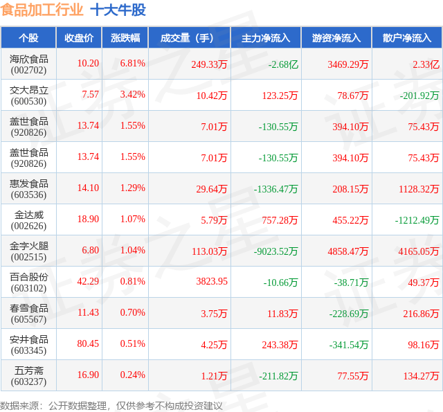 个股表现方面,食品加工行业当日领涨股为海欣食品(002702),该股当日报收10.2,上涨6.81%,成交量249.33万,主力资金净流出2.68亿元。交大昂立(600530)以上涨3.42%紧随其后,该股当日成交量10.42万,主力资金净流入123.25万元。除此之外,盖世食品(920826)、盖世食品(920826)、惠发食品(603536)均进入当日牛股之列。具体个股列表见下表: