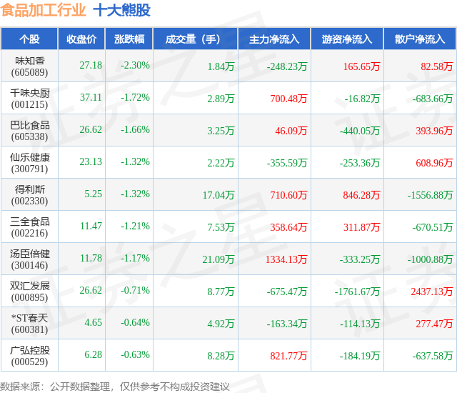 个股表现方面,食品加工行业当日领跌股为味知香(605089),该股当日报收27.18,下跌2.3%,成交量1.84万,主力资金净流出248.23万元。千味央厨(001215)以下跌1.72%紧随其后,该股当日成交量2.89万,主力资金净流入700.48万元。除此之外,巴比食品(605338)、仙乐健康(300791)、得利斯(002330)均进入当日熊股之列。具体个股列表见下表: