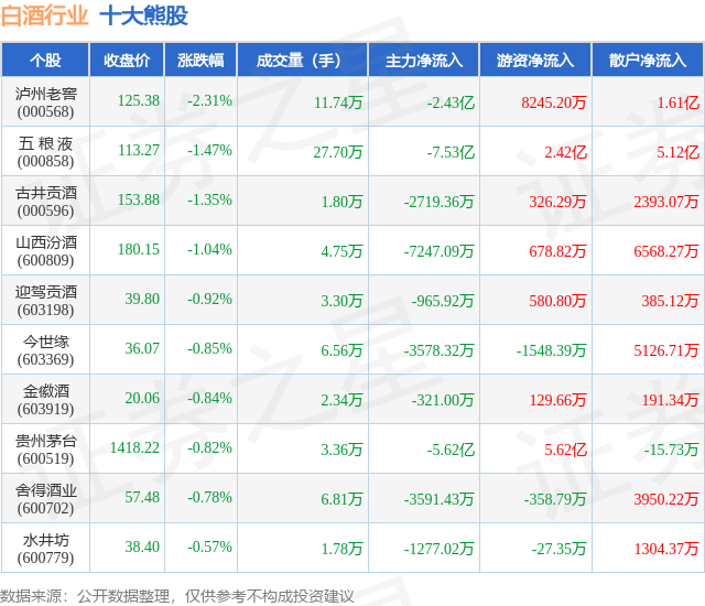 个股表现方面,白酒行业当日领跌股为泸州老窖(000568),该股当日报收125.38,下跌2.31%,成交量11.74万,主力资金净流出2.43亿元。五 粮 液(000858)以下跌1.47%紧随其后,该股当日成交量27.7万,主力资金净流出7.53亿元。除此之外,古井贡酒(000596)、山西汾酒(600809)、迎驾贡酒(603198)均进入当日熊股之列。具体个股列表见下表: