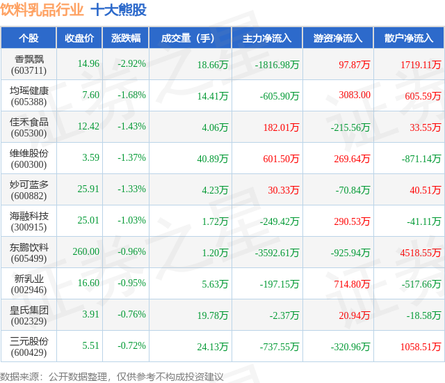 个股表现方面,饮料乳品行业当日领跌股为香飘飘(603711),该股当日报收14.96,下跌2.92%,成交量18.66万,主力资金净流出1816.98万元。均瑶健康(605388)以下跌1.68%紧随其后,该股当日成交量14.41万,主力资金净流出605.9万元。除此之外,佳禾食品(605300)、维维股份(600300)、妙可蓝多(600882)均进入当日熊股之列。具体个股列表见下表: