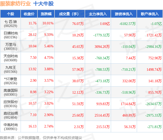 个股表现方面,服装家纺行业当日领涨股为七 匹 狼(002029),该股当日报收11.76,上涨10.01%,成交量76.07万,主力资金净流入1.69亿元。日播时尚(603196)以上涨9.33%紧随其后,该股当日成交量10.29万,主力资金净流出1779.32万元。除此之外,万里马(300591)、天创时尚(603608)、九牧王(601566)均进入当日牛股之列。具体个股列表见下表: