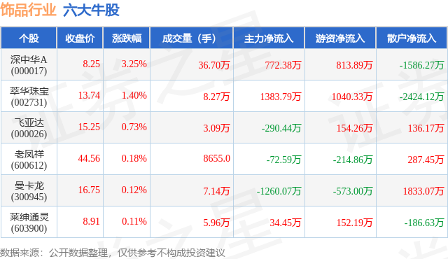 个股表现方面,饰品行业当日领涨股为深中华A(000017),该股当日报收8.25,上涨3.25%,成交量36.7万,主力资金净流入772.38万元。萃华珠宝(002731)以上涨1.4%紧随其后,该股当日成交量8.27万,主力资金净流入1383.79万元。除此之外,飞亚达(000026)、老凤祥(600612)、曼卡龙(300945)均进入当日牛股之列。具体个股列表见下表:
