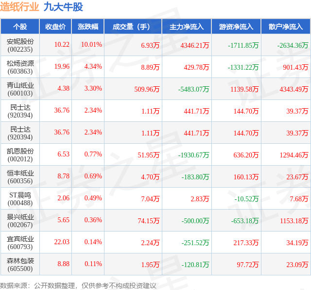 个股表现方面,造纸行业当日领涨股为安妮股份(002235),该股当日报收10.22,上涨10.01%,成交量6.93万,主力资金净流入4346.21万元。松炀资源(603863)以上涨4.34%紧随其后,该股当日成交量8.89万,主力资金净流入429.78万元。除此之外,青山纸业(600103)、民士达(920394)、民士达(920394)均进入当日牛股之列。具体个股列表见下表: