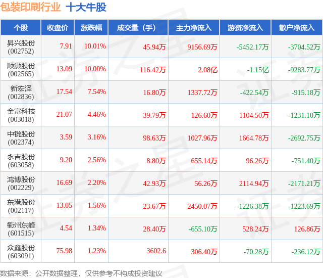个股表现方面,包装印刷行业当日领涨股为昇兴股份(002752),该股当日报收7.91,上涨10.01%,成交量45.94万,主力资金净流入9156.69万元。顺灏股份(002565)以上涨10.0%紧随其后,该股当日成交量116.42万,主力资金净流入2.08亿元。除此之外,新宏泽(002836)、金富科技(003018)、中锐股份(002374)均进入当日牛股之列。具体个股列表见下表: