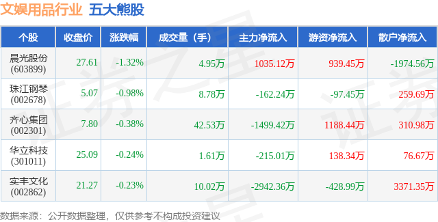 个股表现方面,文娱用品行业当日领跌股为晨光股份(603899),该股当日报收27.61,下跌1.32%,成交量4.95万,主力资金净流入1035.12万元。珠江钢琴(002678)以下跌0.98%紧随其后,该股当日成交量8.78万,主力资金净流出162.24万元。除此之外,齐心集团(002301)、华立科技(301011)、实丰文化(002862)均进入当日熊股之列。具体个股列表见下表:
