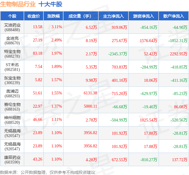 个股表现方面,生物制品行业当日领涨股为艾迪药业(688488),该股当日报收13.58,上涨3.11%,成交量6.52万,主力资金净流入919.06万元。金迪克(688670)以上涨2.49%紧随其后,该股当日成交量8.19万,主力资金净流入275.67万元。除此之外,特宝生物(688278)、ST未名(002581)、东宝生物(300239)均进入当日牛股之列。具体个股列表见下表: