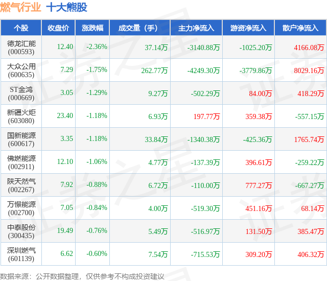 个股表现方面,燃气行业当日领跌股为德龙汇能(000593),该股当日报收12.4,下跌2.36%,成交量37.14万,主力资金净流出3140.88万元。大众公用(600635)以下跌1.75%紧随其后,该股当日成交量262.77万,主力资金净流出4249.3万元。除此之外,ST金鸿(000669)、新疆火炬(603080)、国新能源(600617)均进入当日熊股之列。具体个股列表见下表: