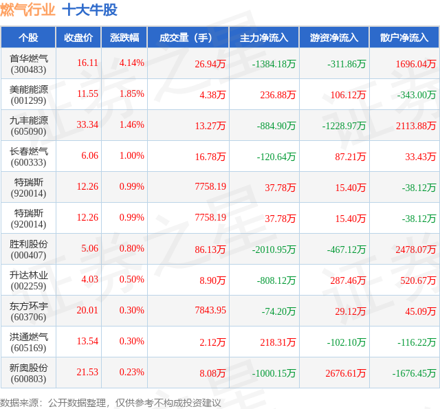 个股表现方面,燃气行业当日领涨股为首华燃气(300483),该股当日报收16.11,上涨4.14%,成交量26.94万,主力资金净流出1384.18万元。美能能源(001299)以上涨1.85%紧随其后,该股当日成交量4.38万,主力资金净流入236.88万元。除此之外,九丰能源(605090)、长春燃气(600333)、特瑞斯(920014)均进入当日牛股之列。具体个股列表见下表: