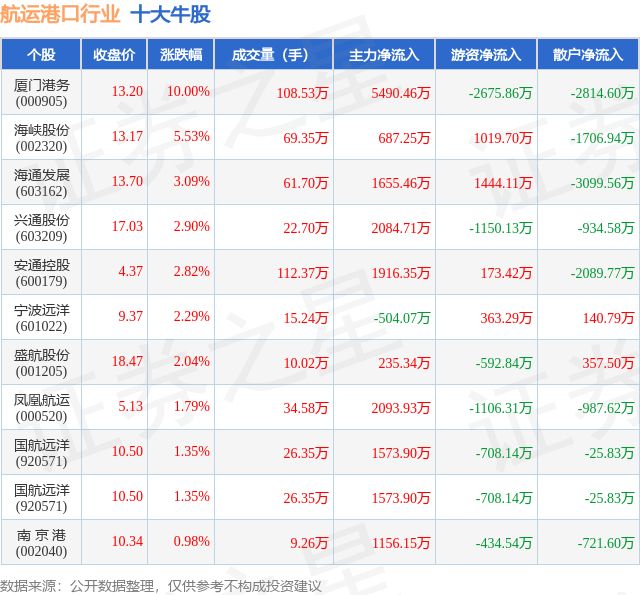 个股表现方面,航运港口行业当日领涨股为厦门港务(000905),该股当日报收13.2,上涨10.0%,成交量108.53万,主力资金净流入5490.46万元。海峡股份(002320)以上涨5.53%紧随其后,该股当日成交量69.35万,主力资金净流入687.25万元。除此之外,海通发展(603162)、兴通股份(603209)、安通控股(600179)均进入当日牛股之列。具体个股列表见下表: