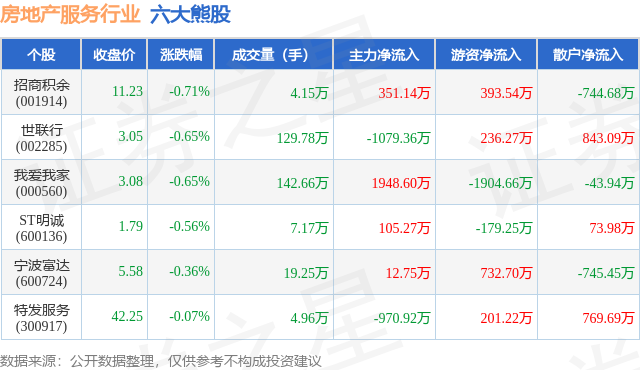 个股表现方面,房地产服务行业当日领跌股为招商积余(001914),该股当日报收11.23,下跌0.71%,成交量4.15万,主力资金净流入351.14万元。世联行(002285)以下跌0.65%紧随其后,该股当日成交量129.78万,主力资金净流出1079.36万元。除此之外,我爱我家(000560)、ST明诚(600136)、宁波富达(600724)均进入当日熊股之列。具体个股列表见下表: