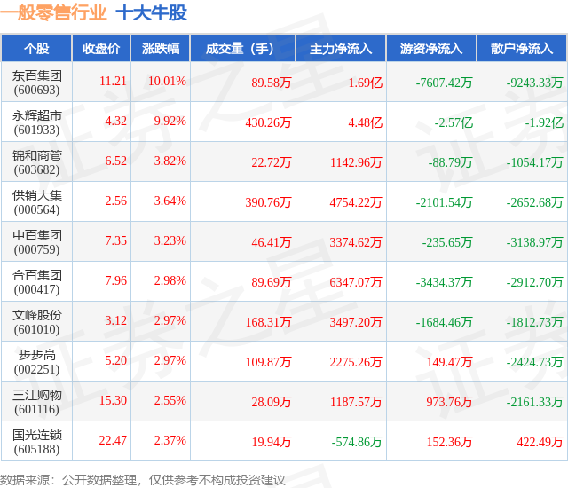 个股表现方面,一般零售行业当日领涨股为东百集团(600693),该股当日报收11.21,上涨10.01%,成交量89.58万,主力资金净流入1.69亿元。永辉超市(601933)以上涨9.92%紧随其后,该股当日成交量430.26万,主力资金净流入4.48亿元。除此之外,锦和商管(603682)、供销大集(000564)、中百集团(000759)均进入当日牛股之列。具体个股列表见下表: