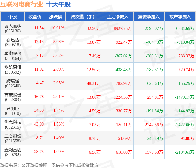 个股表现方面,互联网电商行业当日领涨股为丽人丽妆(605136),该股当日报收11.54,上涨10.01%,成交量32.5万,主力资金净流入8927.76万元。新迅达(300518)以上涨5.03%紧随其后,该股当日成交量13.07万,主力资金净流入922.47万元。除此之外,星徽股份(300464)、华凯易佰(300592)、跨境通(002640)均进入当日牛股之列。具体个股列表见下表: